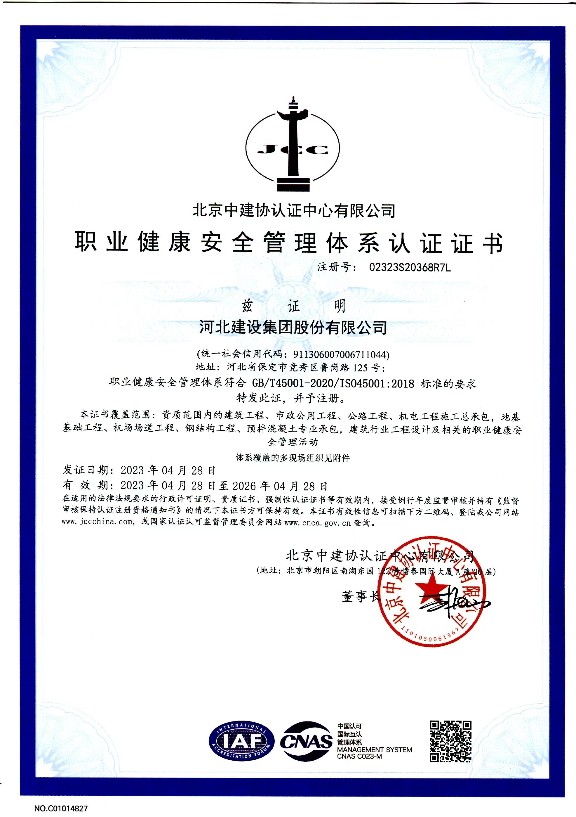 職業(yè)健康安全管理體系認證證書(shū)